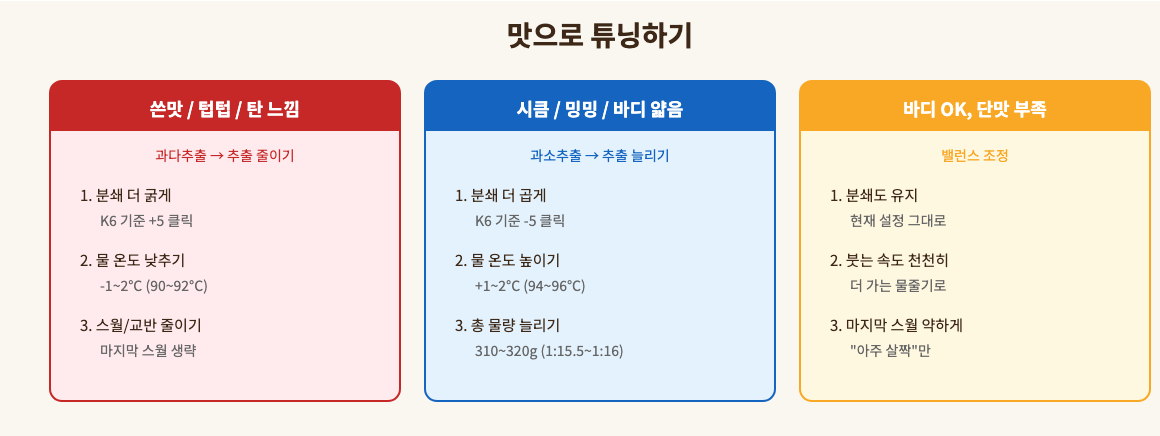 로스팅 프로파일(초콜릿/너티 계열인지 과일향 계열인지)과 현재 추출 결과(쓴쪽/신쪽/밍밍)에 따라 K6 클릭을 더 정밀하게 맞출 수 있으니, 몇 번 내려보면서 본인 취향에 맞는 스윗스팟을 찾아보자.