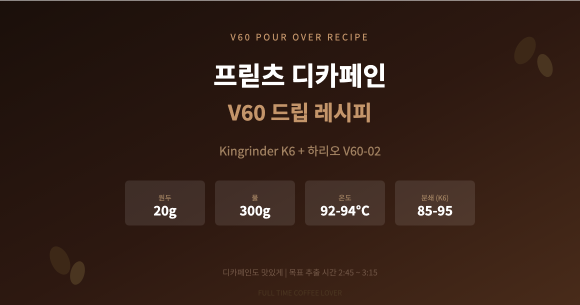 이 글에서는 Kingrinder K6 그라인더와 하리오 V60-02 드리퍼로 프릳츠 디카페인을 맛있게 추출하는 레시피를 정리한다.
